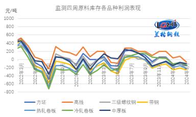 以四周原料库存测算各品种的毛利表现来看,随着各品种的成本下降,市场价格大幅下移,3月份四周库存原料测算品种毛利中,各品种毛利均有所转差;研究中心监测数据显示,监测的七大品种月均亏损幅度扩大35-147元/吨。