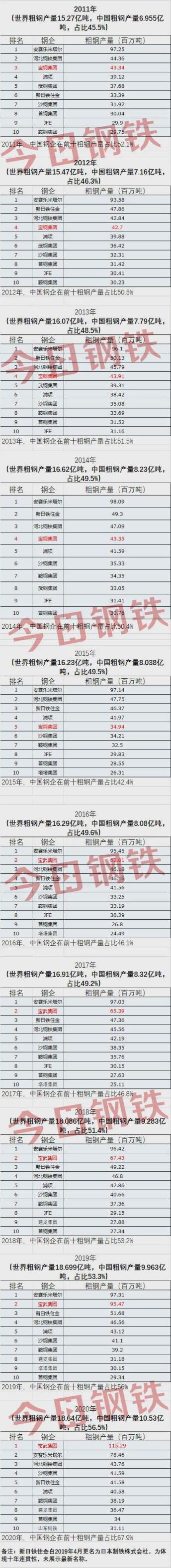 经过2011年到2019年九年的发展,中国宝武积蓄了多方面的发展合力,也包容了多家钢企能量的注入。2020年11月,宝武集团再收购新兴铸管、新疆伊犁钢铁,产能增至1.15亿吨,一举拿下世界钢铁霸主的桂冠!