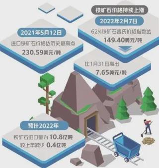 中国铁矿石价格指数监测显示,62%铁矿石直进月均价已从2021年11月94.57美元/吨,升至2022年2月均价148.27美元/吨,2022年2月10日单日价格达到152.46美元/吨。