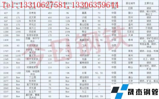 其中日照钢铁杜双华以560亿元人民币荣登胡润排行榜312位,嘉晨钢铁孙寿宽以450亿元人民币荣登胡润第427位,沙钢沈文荣400亿元人民币荣登胡润492位,还有更多优秀钢企老总入列详情如下: