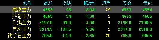 今日螺纹主力期货跌95,收报4553,跌幅2.04%;热卷主力跌94,收报4665,跌幅1.98%;焦煤主力跌93,收报2197,跌幅4.06%;焦炭主力跌181.5,收报2914.5,跌幅5.86%;铁矿石主力跌17收报705,跌幅2.35%。
