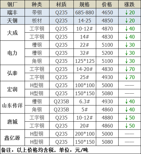 1月17日玉田金州废钢下调50元:1-2厚3300,3-5厚3390,6厚3420,8厚3440钢筋头3440钢筋压块3410新冷板小料3350新镀锌小料3350,08铝散片3270,特级破碎料3490一级破碎料3440生铁暖气片3450不含税