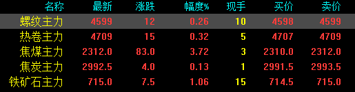 今日螺纹主力期货涨12,收报4599,涨幅0.26%;热卷主力涨15,收报4709,涨幅0.32%;焦煤主力涨83,收报2312,涨幅3.72%;焦炭主力涨4,收报2992.5,涨幅0.13%;铁矿石主力涨7.5收报715,涨幅1.06%。