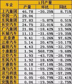 1月我国汽车产销降幅明显,多数车企呈现双位数下跌