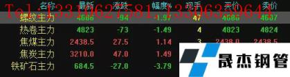 今日螺纹主力期货跌94,收报4686,跌幅1.97%;热卷主力跌73,收报4823,跌幅1.49%;焦煤主力涨27.5,收报2438.5,涨幅1.14%;焦炭主力涨47,收报3210,涨幅1.49%;铁矿石主力跌27,收报684.5,跌幅3.79%。