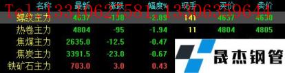 今日螺纹主力期货跌138,收报4637,跌幅2.89%;热卷主力跌95,收报4804,跌幅1.94%;焦煤主力跌12.5,收报2635,跌幅0.47%;焦炭主力跌23,收报3391.5,跌幅0.67%;铁矿石主力涨3,收报703,涨幅0.43%。