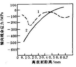 渗碳剂活性太大,渗碳时间过长和渗碳后冷却速度太慢时,渗层中易形成网状或大块状碳化物,这些碳化物主要是渗碳体和合金渗碳体。碳化物的形成导致其周围局部合金元素贫化和淬透性下降,淬火后易形成非马氏体组织。网状和大块状碳化物及非马氏体组织的形成降低了渗层中有利的残余压应力,见图3 ,可使渗碳工件的疲劳强度降低25%~30%。