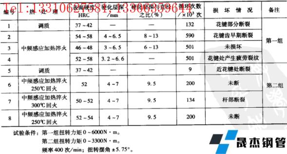 数据表明,感应回火的疲劳寿命较炉中回火为高。其原因是,感应快速加热时,最表层首先瞬时产生马氏体分解,使体积收缩处于相变超塑性阶段,待整体回火完成后表层形成更大的压应力,具有一个更理想的有利于提高疲劳强度的应力分布;而炉内加热缓慢没有这种条件。(3)半轴感应加热表面淬火举例,40MnB钢制造的带法兰半轴的表面淬火工艺技术要求见表8 ,其淬火工艺可以采用连续加热淬火和整体一次加热淬火,工艺参数见表9 和表10 。▼表840MnB钢半轴表面感应淬火技术要求