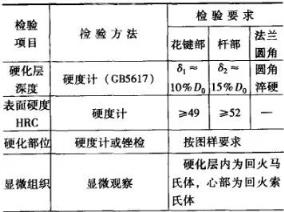 ▲图820CrMnTi半轴渗碳热处理工艺4 半轴的质量检验常用合金结构钢半轴调质的质量检验见表12。半轴表面感应淬火的质量检验见表13。▼表12常用合金结构钢半轴调质的质量检验