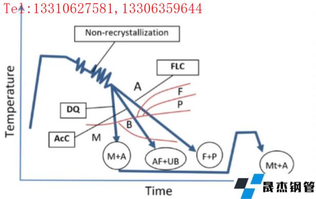 自1980年世界上第一台在线加速冷却装置应用于大工业生产的钢板轧机以来,[1]热机控轧控冷技术经历了三代创新;快速层流冷却(FLC),加速冷却(AcC)和直接淬火(DQ)与在线回火,[2]如图1所示。控制轧制技术主要通过细化铁素体晶粒组织来提高韧性,[3]然而,TMCP通过奥氏体转变为针状铁素体和贝氏体转变而获得带钢的高强度,并增强了韧性。