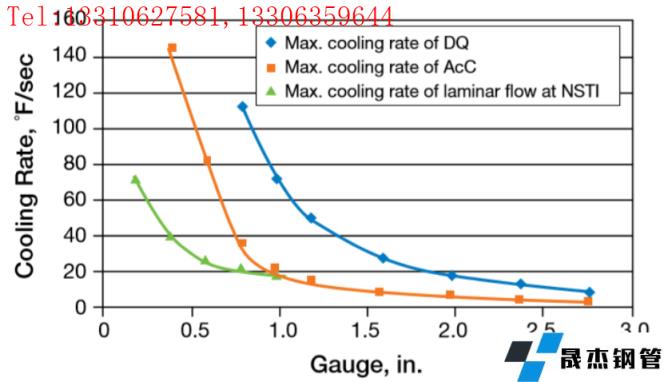 从图5可以看出,当冷却速率介于下临界冷却速率70°F/s(39℃/s)和上临界冷却速率160°F/s(89℃/s)之间时,奥氏体转变为针状铁素体和上贝氏体。当冷却速率低于下临界冷却速率时,最终组织为铁素体珠光体。在这种情况下,DQ-AcC装置的作用类似于层流冷却系统。当冷却速率大于上临界冷却速率时,最终的组织为带有下贝氏体的针状铁素体或具有马氏体的残余奥氏体,在这种情况下,产品不能满足A572 50级2型的延展性要求。