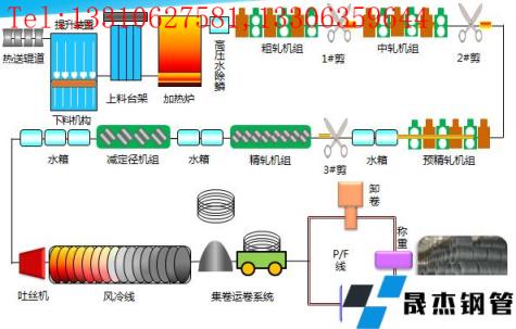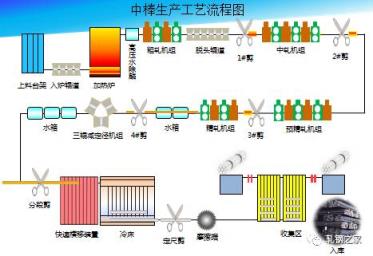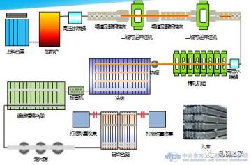 加热炉、高压水除鳞、轧机、轮廓仪或测径仪、剪或锯、热打印机、冷床、矫直机、编组台架、码垛台架、打捆机、称重设备、喷标等设备