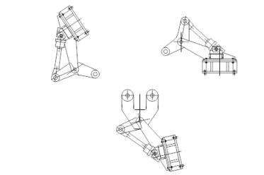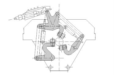 5.2.3.3 平衡装置由于PQF三辊轧机轧辊的特殊装配方式,平衡装置也配套采用新型设计,其装置为液压缸带动一拨叉,拨叉压在“C”形臂的“肩”上,压下装置的力是向轧制中心线的力,平衡力是反力。由于PQF的布置方式,三个平衡叉中,上两个为单向拨叉,下面的一个为双向拨叉。它们的行程为:上两个:100mm;下拨叉:81mm。平衡叉结构见图5-22。