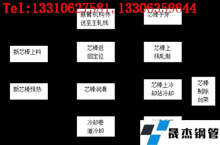 芯棒经返回辊道返回,途中经过三个冷却巷道进一步冷却,并经润滑站(芯棒横移小车前)润滑,芯棒返回至芯棒预热炉出口前挡板定位。完成芯棒循环全过程。