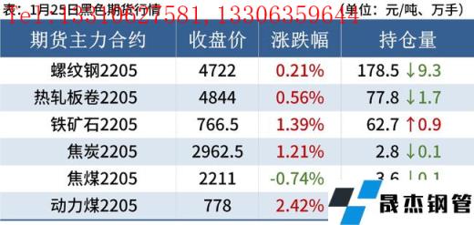 焦炭:1月25日,焦炭市场暂稳运行。山西长治地区今日有环保部门会议,1月30日-3月13日冬奥会期间,区域内焦企结焦时间延长至72小时限产政策影响;个别焦企明后两天,环保管控结焦时间将延长至72小时,大部分焦企暂无接到冬奥会相关限产通知。本周焦企开工小幅上升,焦炭产量增加,下游无缝钢管厂采购依旧积极,焦炭整体库存也在低位,出货无阻。冬奥会临近,各个地区无缝钢管厂限产预期较强,焦炭需求或有下降,无缝钢管厂补库情绪减弱。焦煤价格继续维持高位,焦炭成本压力依然较大,预计短期内焦炭市场继续偏稳运行,后期需继续关注环保政策、冬奥会、原料成本对焦炭价格的影响。