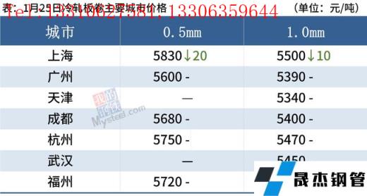 冷轧板卷:1月25日,全国24个主要城市1.0mm冷卷均价5466元/吨,较上个交易日下跌1元/吨。现货市场已经进入有价无市状态。冬奥会临近,部分无缝钢管厂受到环保政策的影响,陆续发布停产检修计划,对市场资源供给有一定影响,再加上原料价格上涨,使得目前冷轧板卷价格处于相对高位。综合来看,故预计26日国内冷轧板卷价格或将平稳运行。