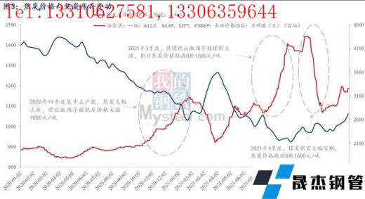 2)而2021年虽没有再出现2020年4季度集中大幅去产能的情况。但仍出现了2021年三季度焦炭价格大涨1600元/吨的情形,两个半月涨幅48%,涨幅明显高于2020年四季度。这主要是由于焦煤供应受限导致的煤价大涨推升焦炭成本大幅上涨,以吕梁低硫主焦煤来看,其价格从6月底至9月底涨了一倍(2050-4100元/吨),焦炭供应矛盾从产能约束转移至原料供应受限。同样的,2021年四季度后,国家出台煤炭保供政策,原料供应大幅缓解,同时需求端铁水产量大减,最终传导至焦煤价格大跌,焦炭价格应声回落1600元/吨。