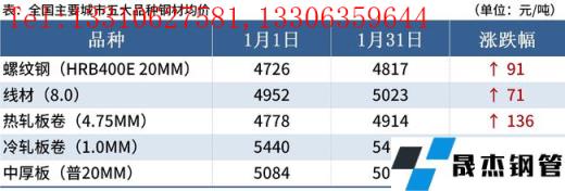 1月国内向日葵色视频在线观看无缝钢管市场整体呈现了震荡偏强走势,而板材价格分化明显,螺纹钢修复性反弹近百元,热轧板卷上涨了136元,但中厚板表现趋弱。原料方面价格涨幅强于预期,1月在无缝向日葵色视频在线观看钢管厂家复产和节前补库需求支撑下,铁矿石价格持续上涨,62%澳洲粉矿港口现货价格指数960.0元/湿吨,环比月初上涨158.0元/湿吨,涨幅19.7%。整体来看,宏观消息面利好,向日葵色视频在线观看无缝钢管供应快速下滑,导致库存累积幅度不及预期,而需求结束较晚,使得钢价走强。