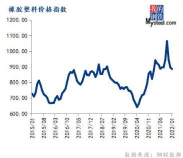 1月份橡胶塑料价格指数为885.45,环比下跌1.29%,同比上涨7.55%。