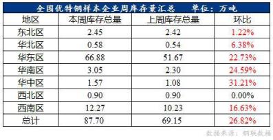 全国优特钢棒材样本总库存87.7万吨,环比上升18.55万吨,增幅26.82%。