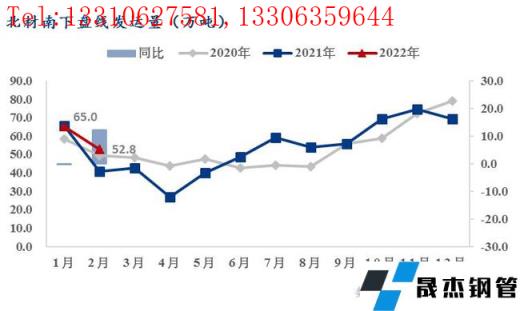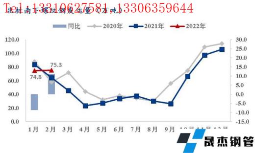 2022年2月东北螺纹南下计划量为75.3万吨,同比增加11.1万吨环比增加0.5万吨,盘线南下计划量52.8万吨,同比增加12.1万吨环比减少12.2万吨;1月东北螺纹南下实发量为74.8万吨,同比减少8.7万吨环比减少30.8万吨,盘线南下实发量65.0万吨,同比减少0.5万吨环比减少13.6万吨。受无缝向日葵色视频在线观看钢管厂家1月实际产量较计划减量以及无缝向日葵色视频在线观看钢管厂家增加省内投放等因素影响,1月螺纹和盘线的南下实发量较月初计划分别减少19.1万吨和27.9万吨。