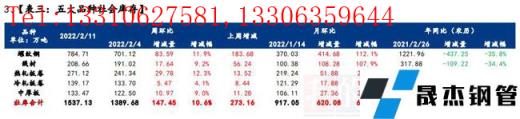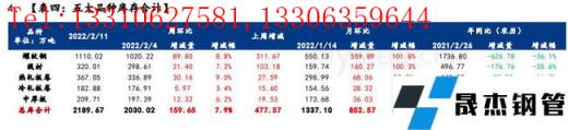 据统计,本周五大品种库存总量为2189.67万吨,环比节后第一周增加159.65万吨,其中建材库存增加111.2万吨,增幅为8.4%;板材库存增加48.45万吨,增幅6.8%。上期库存总量为2030.02万吨,环比节前增加477.57万吨,其中建材库存增加414.85万吨,增幅为45.9%;板材库存增加62.72万吨,增幅9.7%。