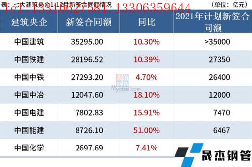 从各大央企签单数据来看,截止2月11日,共有7家建筑央企公布其2021年新签合同额情况。总体来看,这7家建筑央企1-12月同比均实现正增长,累计新签合同总额超12万亿元,较去年同期(108812亿元)增长12%。