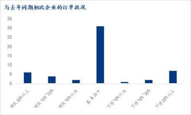 调研样本企业中,订单状况与去年同期相比增长20%以上的占比为11.32%,与去年同期相比增长10-20%的占比为7.55%,与去年同期相比增长10%以内的占比为3.77%,与去年同期相比基本持平占比最大,为58.49%;与去年同期相比下滑10%以内的占比为1.89%,与去年同期相比下滑10-20%的占比为3.77%,与去年同期相比下滑20%以上的占比为13.2%。