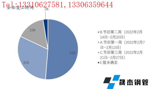 2、节后复工时间较去年同比明显提前。调研时已全部复工的企业占比59%;已部分复工的企业占比26%。节后第一周(2022年2月7日-2月14日)能全部复工的占比31%;节后第二周节后第二周(2022年2月15日-2月22日)能全部复工的占比51%。