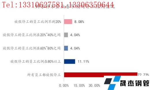 从图5上看,放假停工的员工比例不到20%的占比为8.08%;放假停工的员工比例在20%-60%的占比为4.04%;放假停工的员工比例在60%-80%的占比为4.04%;放假停工的员工比例在80%以上的占比为11.11%;所有员工都放假停工的占比为72.73%。