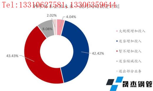 从图30上看,未来一段时间企业会大规模增加投入的占比为4.04%,适当增加投入的占比为42.42%,暂不增加投入的占比为43.43%,适当缩减投入的占比为8.08%,退出部分业务的占比为2.02%。