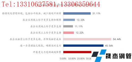 从图32上看,希望开展更大力度的减税降费支持的占比为67.78%;进一步清理拖欠账款,确保及时支付的占比为45.56%;在企业融资上给予更多支持,并降低融资成本的占比为54.44%;在企业用工上给予更多支持的占比为12.22%;在企业用地上给予更多支持的占比为11.11%;在企业用能上给予更多支持和保障的占比为13.33%;持续优化营商环境,包括公平执法、减少微观干预等的占比为31.11%。
