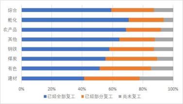 从未复工的企业调研情况来看,截至2月11日,计划在2月7日-13日(节后第一周)复工的企业占比11.5%,计划在2月14日-29日(节后第二周)复工的企业占比17.6%。预计节后两周内,超九成企业都将完成复工,钢铁、能化、农产品行业企业复工率预计达到93%以上。