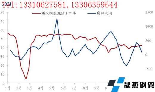 而对于2021年的数据来说无论是相关分析还是回归分析结果表现出与其他年份有不同的结果,这与2021年的特殊情况有关。由于2021年螺纹钢价格的急剧变化,导致电弧炉实际利润具有了极强的波动性,而且由于能耗双控,从8月底电弧炉无缝向日葵色视频在线观看钢管厂家被严格限产,导致了电弧炉开工率有近20%左右的持续下降,创造了历史低位,政策以及成材价格变动明显干扰了数据的观测,如下图所示: