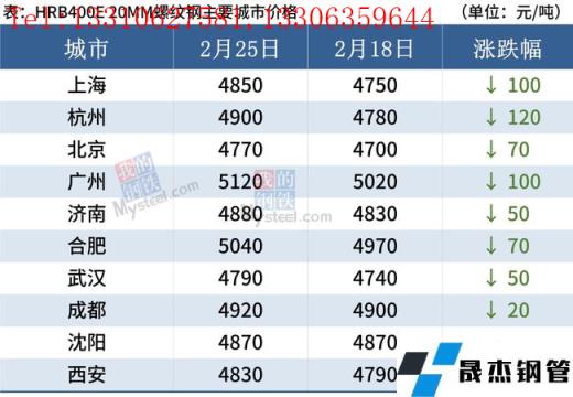 截至2月25日,全国主要城市20mm三级抗震螺纹钢均价4869元/吨,周环比下跌53元/吨;8.0mmHPB300高线均价5067元/吨,周环比下跌58元/吨。