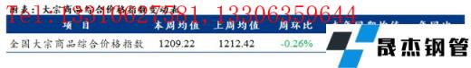 全国大宗商品综合价格指数均值为1209.22,环比下降,降幅0.26%(前值4.39%);同比上升,增幅15.19%(前值17.06%)。