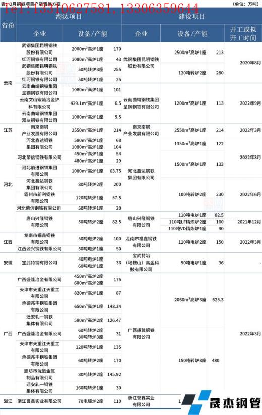据不完全统计,2022年2月有9家无缝向日葵色视频在线观看钢管厂家发布钢铁产能置换方案。其中,涉及新建炼钢产能1328万吨,新建炼铁产能1320.3万吨;涉及淘汰炼钢产能超1567.92万吨,淘汰炼铁产能1395.56万吨。