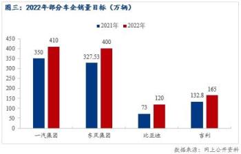 除以上车企外,在网上的公开资料还了解到,广汽集团2022年产销目标同比增长15%,长城汽车销量目标190万辆;“蔚小理”销量目标均超过20万辆;华为销量目标30万辆等。从以上车企的销量目标来看,大部分车企对于今年的汽车市场寄予厚望。