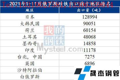 2021年1-11月,俄罗斯硅铁合计出口39万吨,其中出口至日本12.899万吨,韩国9万吨,印度1.12万吨,占据总出口量约59%.。据俄罗斯相关企业透露,2021年俄罗斯硅铁产量56.48万吨,出口量42.54万吨。