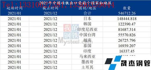 2021年1-12月硅铁出口总量54.67万吨,较去年增长97.77%。2021年1-12月硅铁进口总量4.31万吨,较去年增长88.05%;其中出口日本14.84万吨,出口韩国12.23万吨。