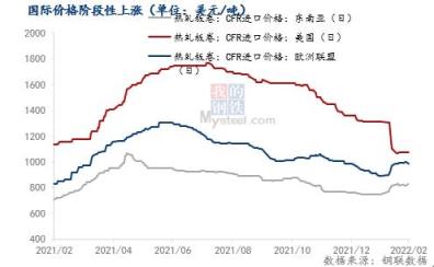 国际钢价自俄乌冲突以来迎来了阶段性上涨。截至2月28日,欧盟及东南亚进口CFR价格月环比分别上涨100美元/吨和82美元/吨;同时,美国进口价格也在2月中下旬停止了下跌趋势开始企稳。