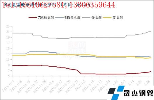 受玉米原料上调影响,近期各厂家报价较为坚挺,截止今日,国内70赖氨酸市场价格涨至6.4-7.1元/公斤之间,98赖氨酸涨至11.8-12.5元/公斤之间,苏氨酸市场稳定运行在11.2-12元/公斤之间,蛋氨酸市场偏强运行在21元/公斤以上,色氨酸稳中上调至50-55元/公斤之间。虽然部分地区部分品牌仍有低于市场的成交价格,但货源较少,市场多数仍在观望为主,部分贸易商价格停报停签,或者低价不签,多数仍看好后市行情。