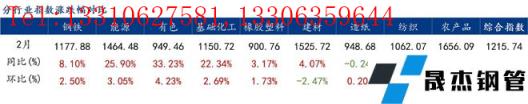 环比来看,2月份钢铁、能源、有色、基础化工、橡胶塑料、造纸、纺织、农产品等8个行业价格指数上涨,仅建材价格指数下跌。
