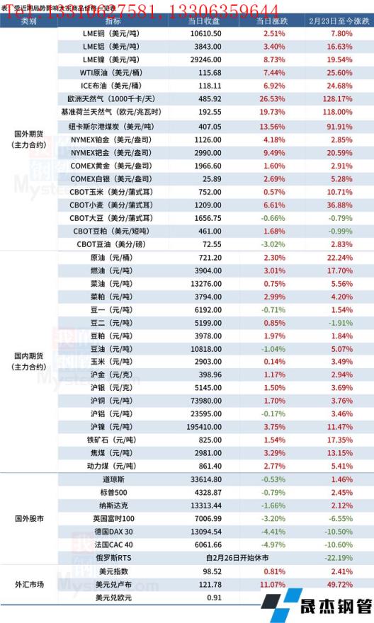 受近期局势影响大宗商品价格一览表(3月4日)