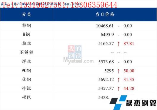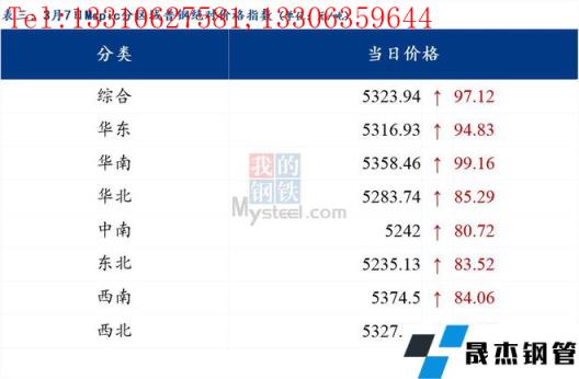 3月7日普钢绝对价格指数变化:综合指数5323.94,上涨97.12;螺纹钢指数5050.76,上涨96.72;线材指数5381.55,上涨87.69;热轧板卷指数5290.22,上涨130.08;冷轧板卷指数5691.7,上涨102.11;中厚板指数5275.26,上涨75.98。