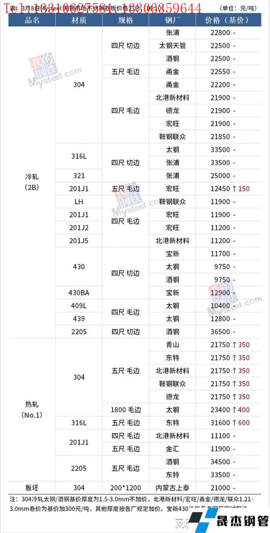 3月8日无锡市场300系价格偏强运行,日内民营冷热轧价格涨幅1550-1600元/吨,截至下午四点,民营304冷轧主流价格至21900-22000元/吨毛基,民营热轧资源五尺毛边主流价格至21650-21950元/吨;200系价格偏强运行,日内冷热轧有400元/吨左右的上涨,截至下午四点,无锡市场201J2/J5四尺冷轧价格主流成交在11200-11300元/吨毛基,五尺热轧主流成交在11900-12000元/吨;400系价格稳中偏强运行,目前太钢、酒钢430冷轧切边主流价格9750-9900元/吨。