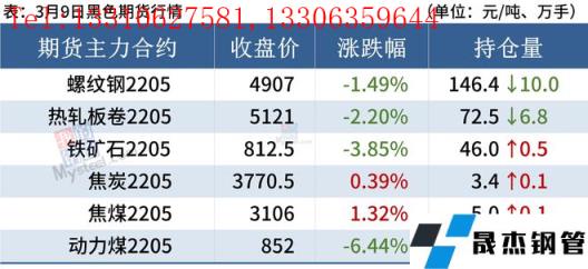 热轧板卷:3月9日,全国24个主要城市4.75mm热轧板卷均价5221元/吨,较上个交易日下跌47元/吨。黑色商品期货市场震荡下跌,早盘走弱,现货报价小幅下跌,成交表现不佳,午后期卷继续走低,下游采购量收缩,全天成交较差,商家套现意愿增强。综合来看,前期热卷期现货价格大幅拉涨,市场恐高情绪浓厚,高价位成交受阻,需求释放不及预期,商家欲获利套现,价格出现一定程度回落,但高成本和低库存以及国内外价差都将抑制钢价大幅下跌。综合来看,预计10日热轧板卷价格或震荡偏弱为主。