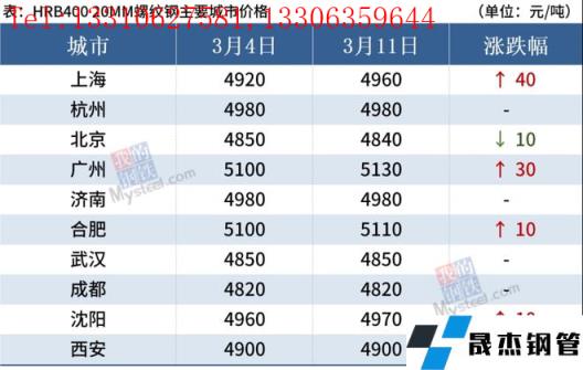 截至3月11日,全国主要城市20mm三级抗震螺纹钢均价4952元/吨,周环比上涨6元/吨;8.0mmHPB300高线均价5164元/吨,周环比上涨3元/吨。