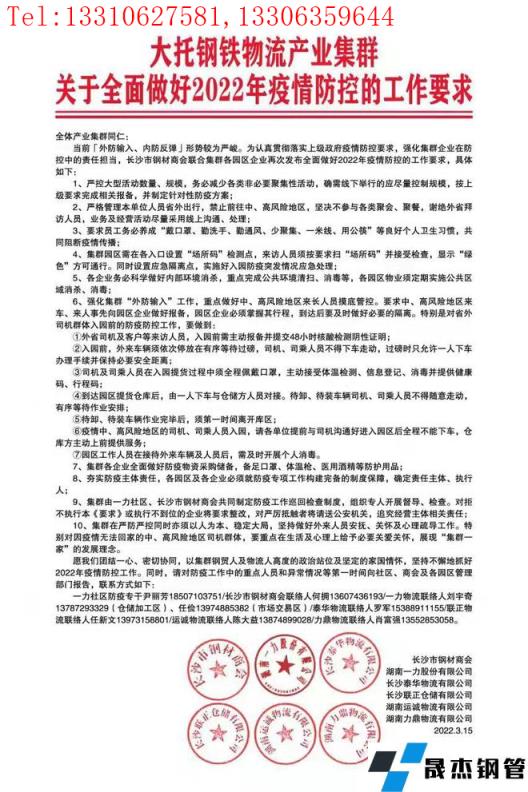 继3月14日长沙新增1例外省输入新冠病毒核酸检测初筛阳性后,相关部门已立即采取应急处置措施。据小编了解,为认真贯彻上级政府疫情防控要求,本地钢铁生产企业加强防控,层层核实人员情况,目前生产供应情况一切正常。向日葵色视频在线观看无缝钢管市场交易活动有序进行,暂无工地受此影响停工。为防患于未然,长沙市向日葵色视频在线观看无缝钢管商会联合集群各园区企业再次发布全面做好2022年疫情防控的工作要求,具体情况如下: