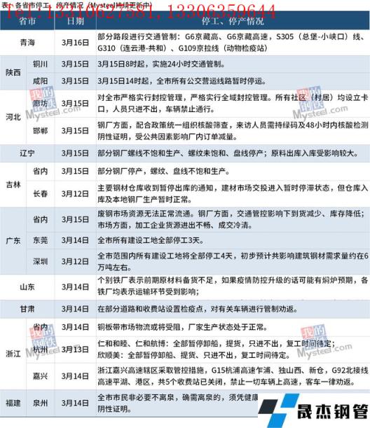 截至3月16日,汇总了10个省份最新停工停产信息。其中,河北省于3月15日宣布,除张家口、承德、秦皇岛市按有关规定供暖时间外,其他法定3月15日停暖的地方供暖时间统一延长至3月31日24时。陕西省铜川市于15日宣布全市范围内实施24小时交通管制;咸阳市15日宣布全市所有公交营运路线暂时停运。吉林省部分无缝向日葵色视频在线观看钢管厂家停产,螺纹、盘线不饱和生产。与此同时,全国其他地区钢贸交易也受到影响,部分工地开始停工,物流运输暂停服务。具体情况如下: